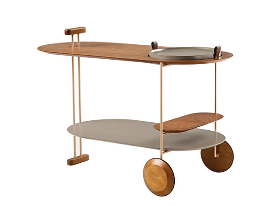 Infinitas possibilidades de configuração podem ser geradas no carro bar Kyo que surpreende pela mistura de diferentes materiais, acabamentos e detalhes, provocando característica única repleta de significado e atração. Estrutura metálica. Rodas, bandeja e o pegador são produzidos em madeira maciça de tauari. Tampos em MDF revestido com lâmina natural de madeira cinamomo. Alças da bandeja feita em couro reconstituído disponível na cor marrom e preta.