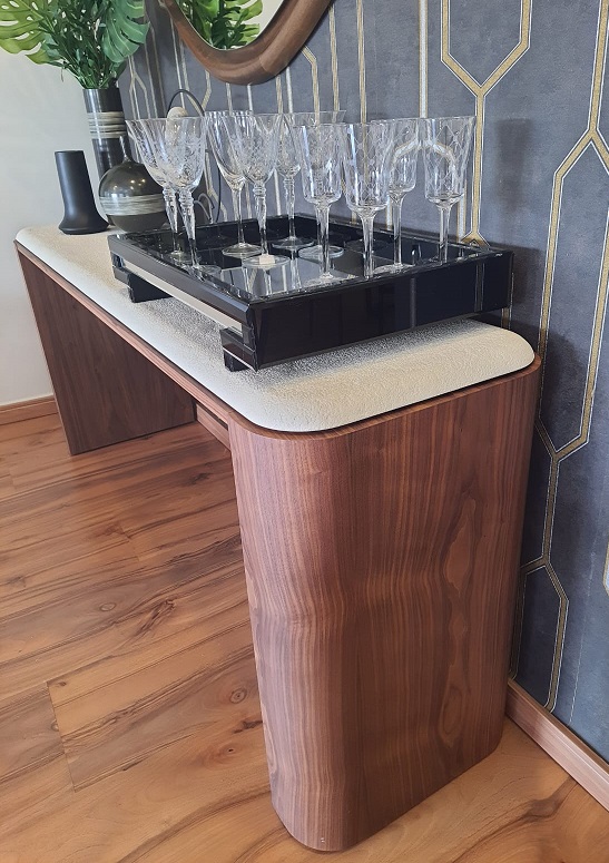 Tampo laminado que traz textura e sofisticação, combinado com pés em metal que garantem leveza e estabilidade. Uma peça elegante e versátil para valorizar qualquer ambiente.