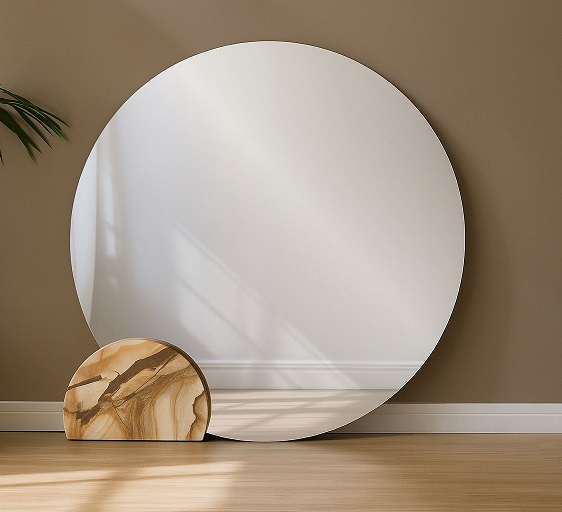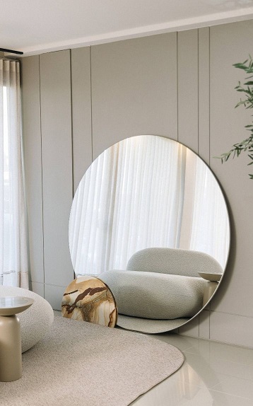 O Espelho Aurora tem estrutura em MDF e base semicircular, que pode ser em pedra natural, madeira maciça ou MDF laqueado. A peça equilibra leveza e solidez, refletindo a ideia de continuidade e ampliando visualmente o espaço. Design por Faenza.