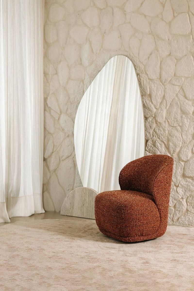 Com estrutura em MDF e base disponível em pedra natural, madeira maciça ou MDF laqueado, o Espelho Folha une forma orgânica e contraste de materiais.