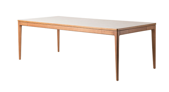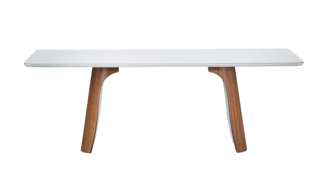 A mesa vem do desejo de criar uma forte unidade entre a base e o tampo da mesa, mantendo um grande senso de equilíbrio formal e estético. Base possui duas extremidades que são compensados anatômicos que sustentam o tampo da mesa, equilibrando notavelmente ao produto. Tampo em MDF com vidro pintado e colado.