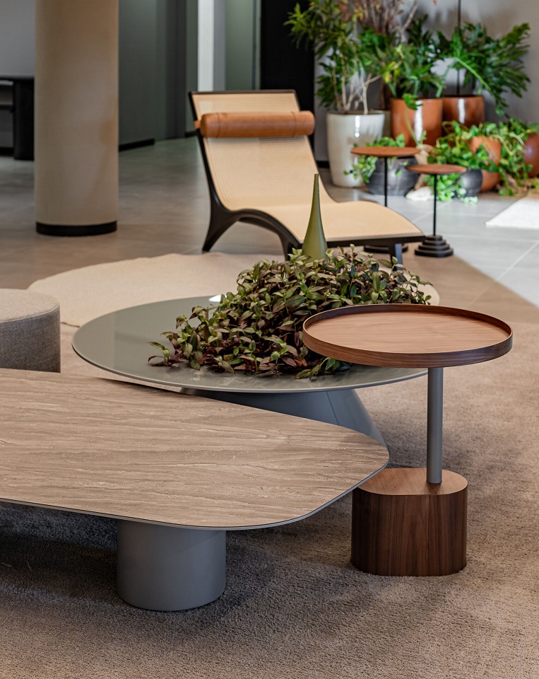 A mesa de apoio Ivy pode ser usada como um item de destaque ou de harmonização para o espaço. Disponível nos formatos oval e redondo.